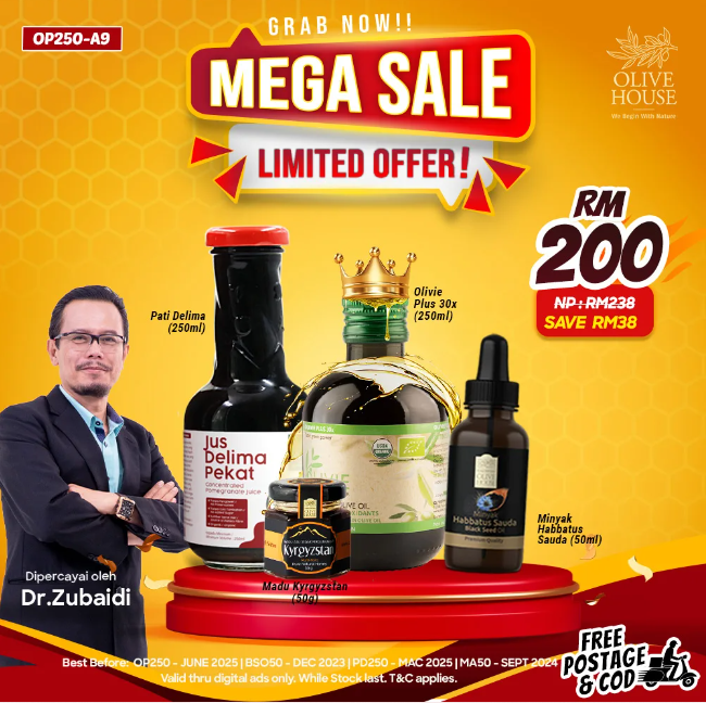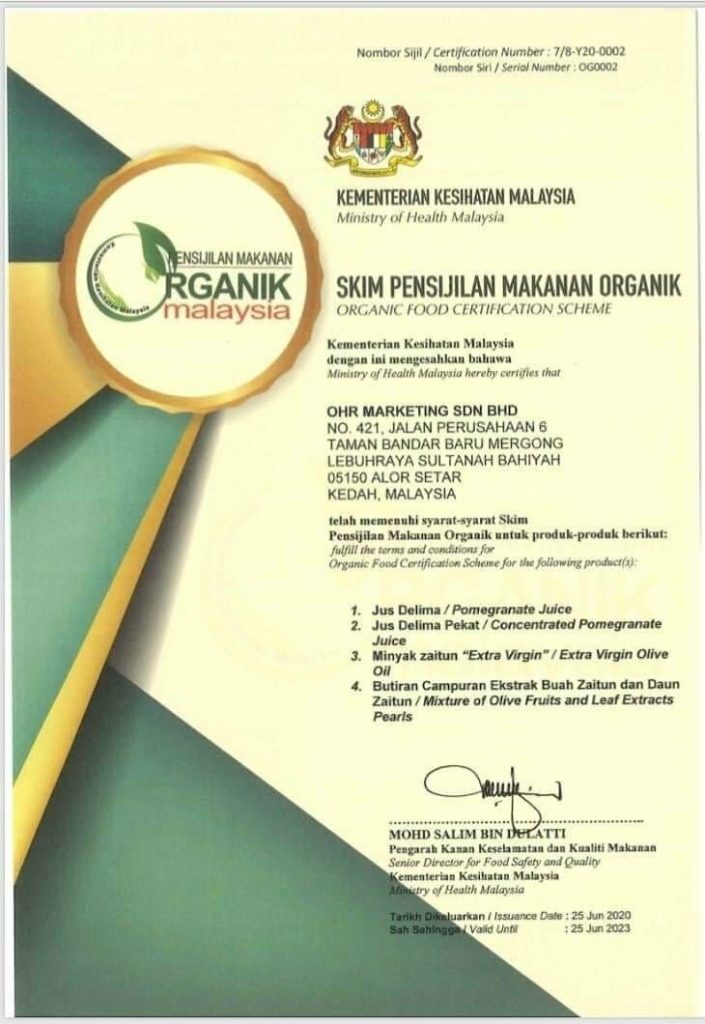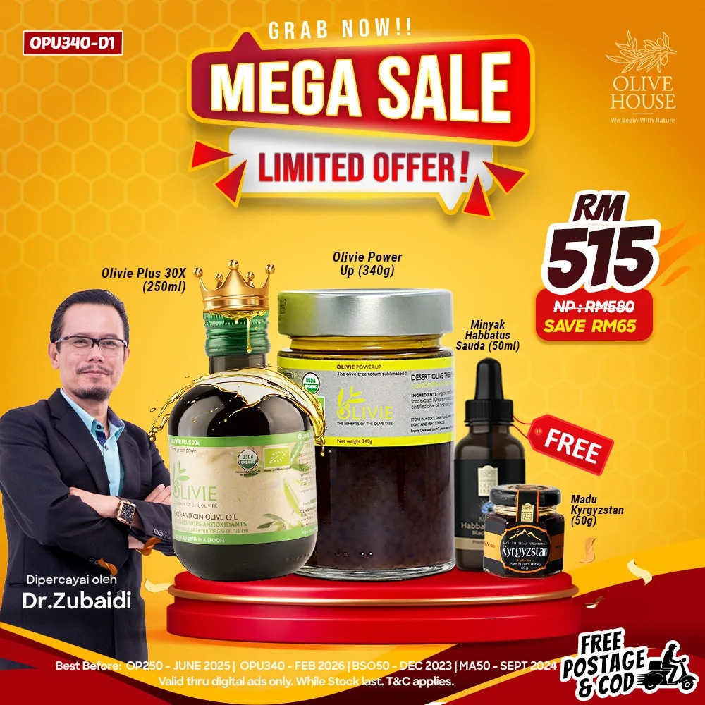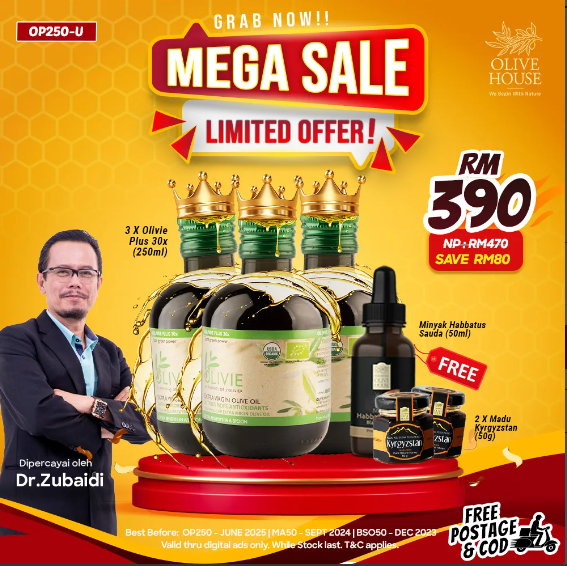“Makanan semulajadi, dihasilkan secara organik 100% ekstrak dahan, daun zaitun serta buah zaitun muda.”-Olivie Power Up